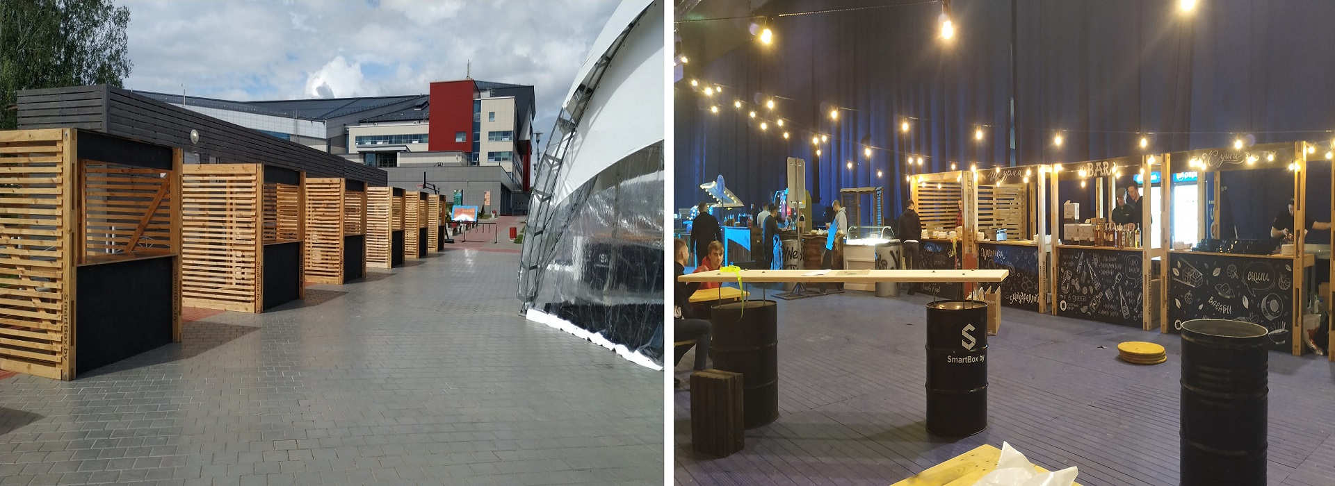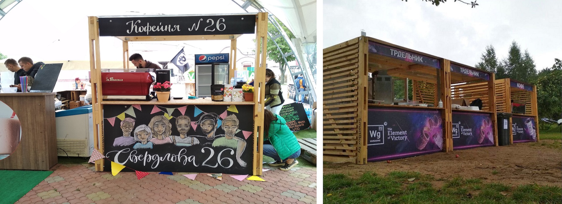 Аренда бовера из сосны для фудкортов ярмарок и базаров. Сборная деревянная конструкция с реечными стенами, крышей, деревянным полом и меловыми рекламными фризами. Размер деревянной конструкции 2м х 2м и монтаж/демонтаж занимает всего 12-15 минут.Скидка на вторые и последующие сутки 50%